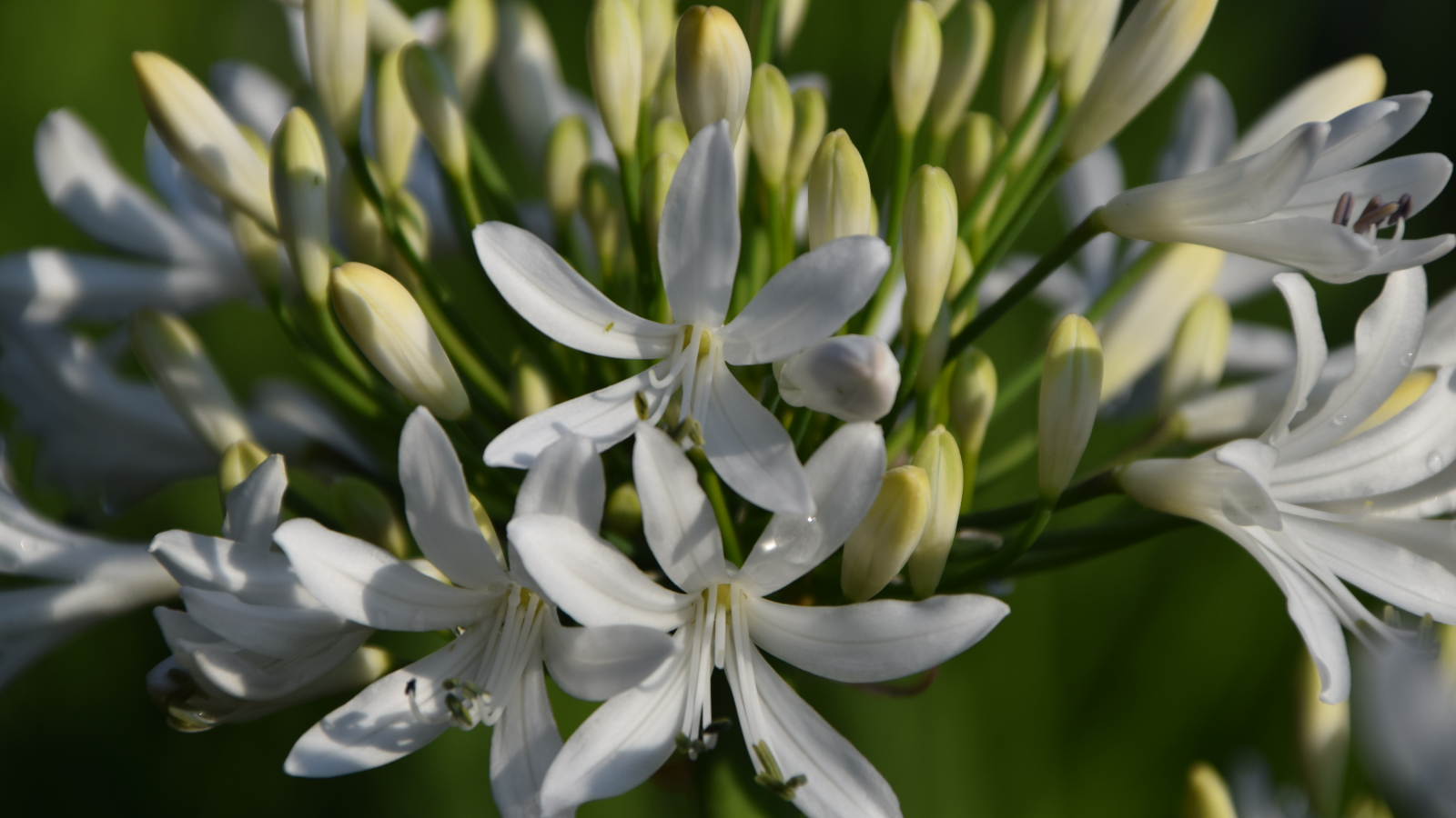 Bladverliezende Agapanthus, bloeit rijkelijk met witte bloemen aan stevige stengels. Zeer rijkbloeiend en bloeit met mooie volle bollen.